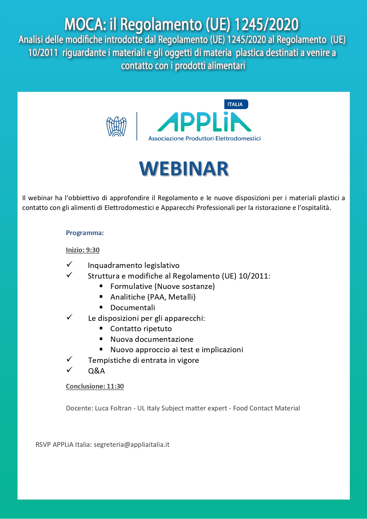 EFCEM Italia, in collaborazione con UL, ha organizzato un webinar della durata di 2 ore che si è tenuto Venerdì 19 Marzo sul tema: “MOCA: Il Regolamento UE 1245/2020. Analisi delle modifiche introdotte al Regolamento (UE) 10/2011 riguardante i materiali e gli oggetti di materia plastica destinati a venire a contatto con i prodotti alimentari”.